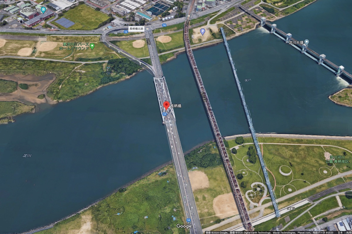 この橋、大阪市内から吹田方面に向かって北向きに走り、