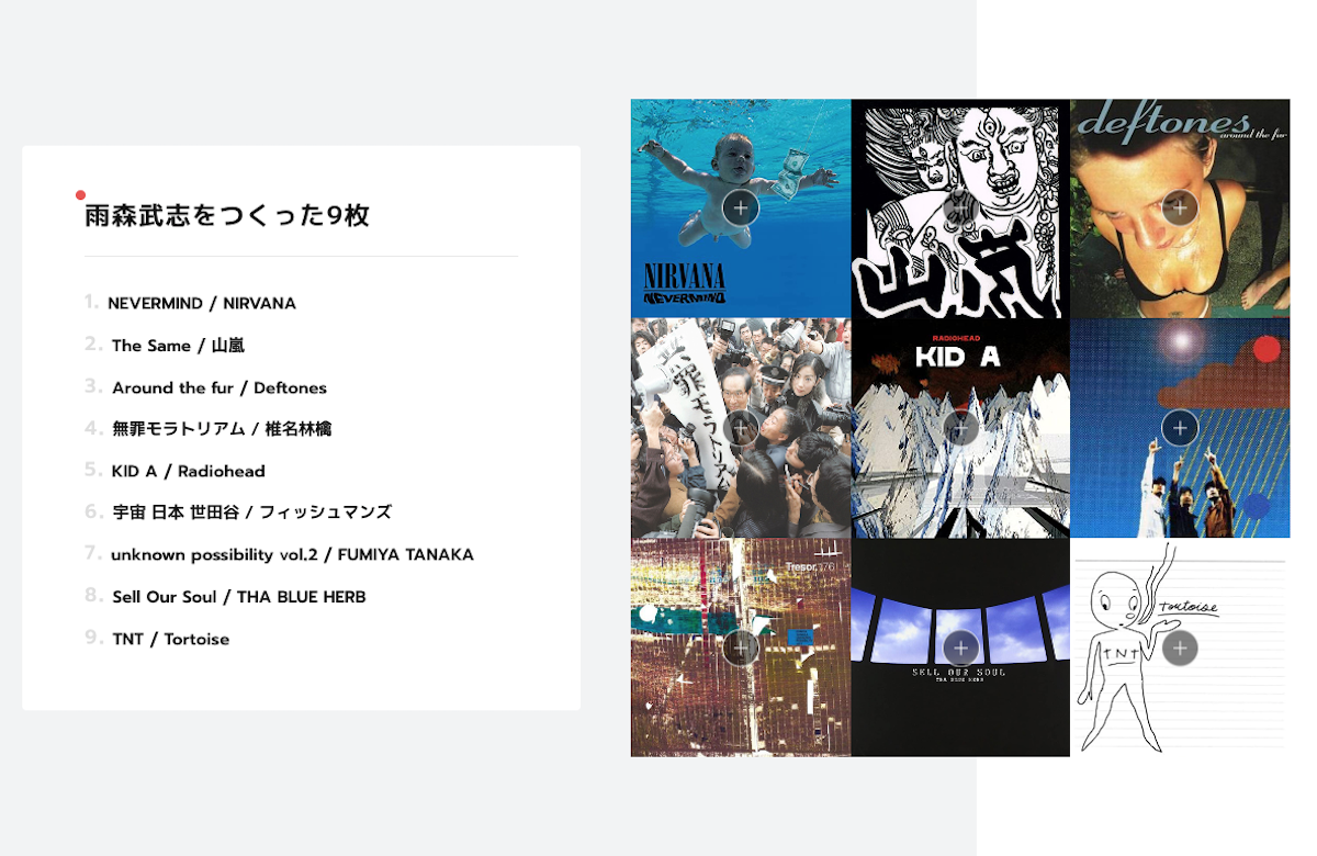そして、このページの中には「雨森武志をつくった9枚」というコンテンツがあります。