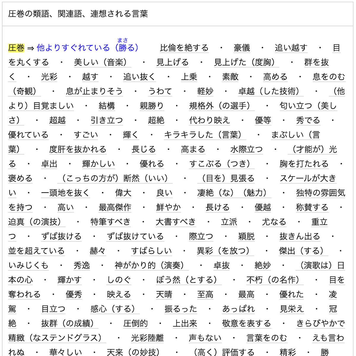 とは言え、そんな僕だって何かの原稿を書きながら「あ、ここで“圧巻”的な言葉を入れたいな」と思うこともあるわけです。そんな時に登場するのが類語辞典。『圧巻 類語』で検索すれば、即解決です。ああ、なんて便利な時代。昔のコピーライターさんにこんなことを言ったら怒られたんでしょうけど……。