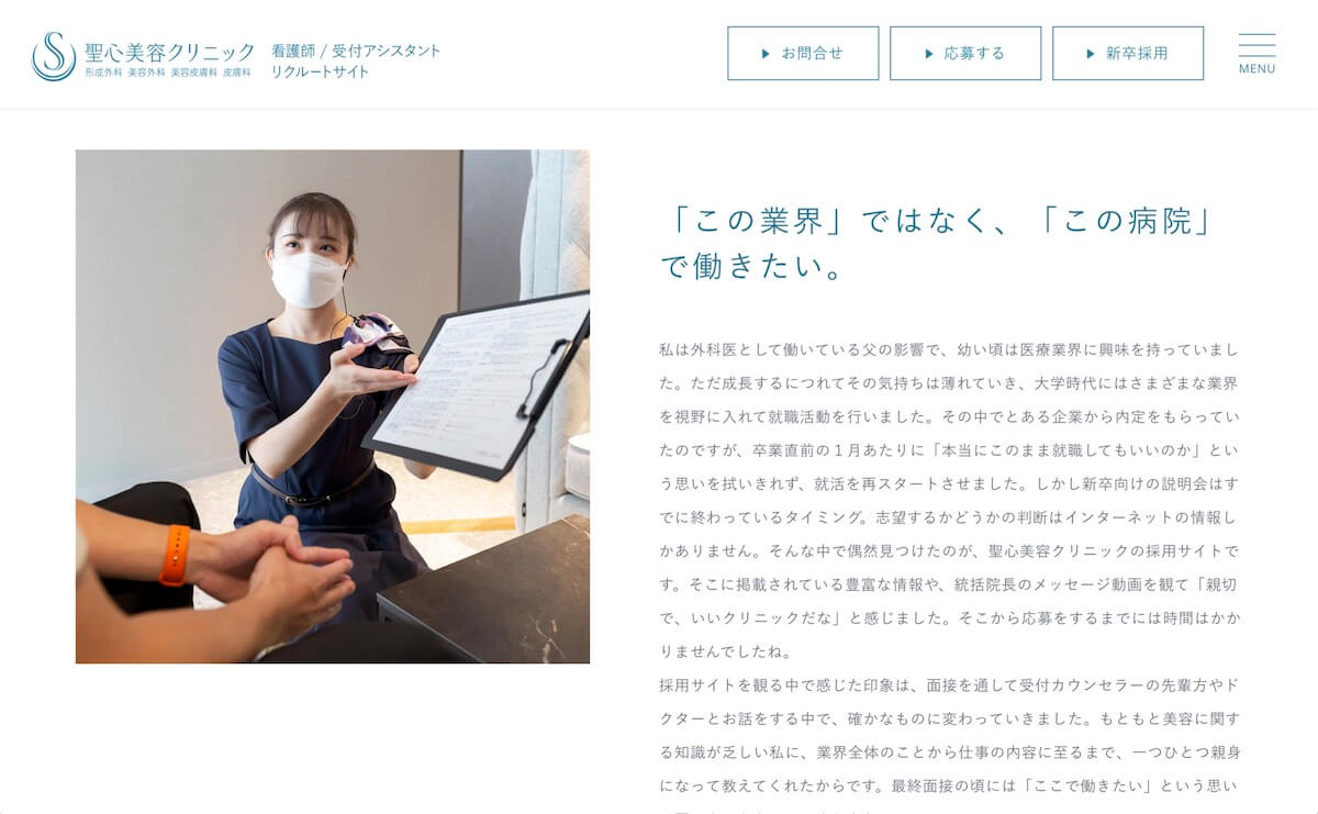 3年ほど前に公開し、つい先日、新しいコンテンツの追加が完了した聖心美容クリニック様の採用サイトです。