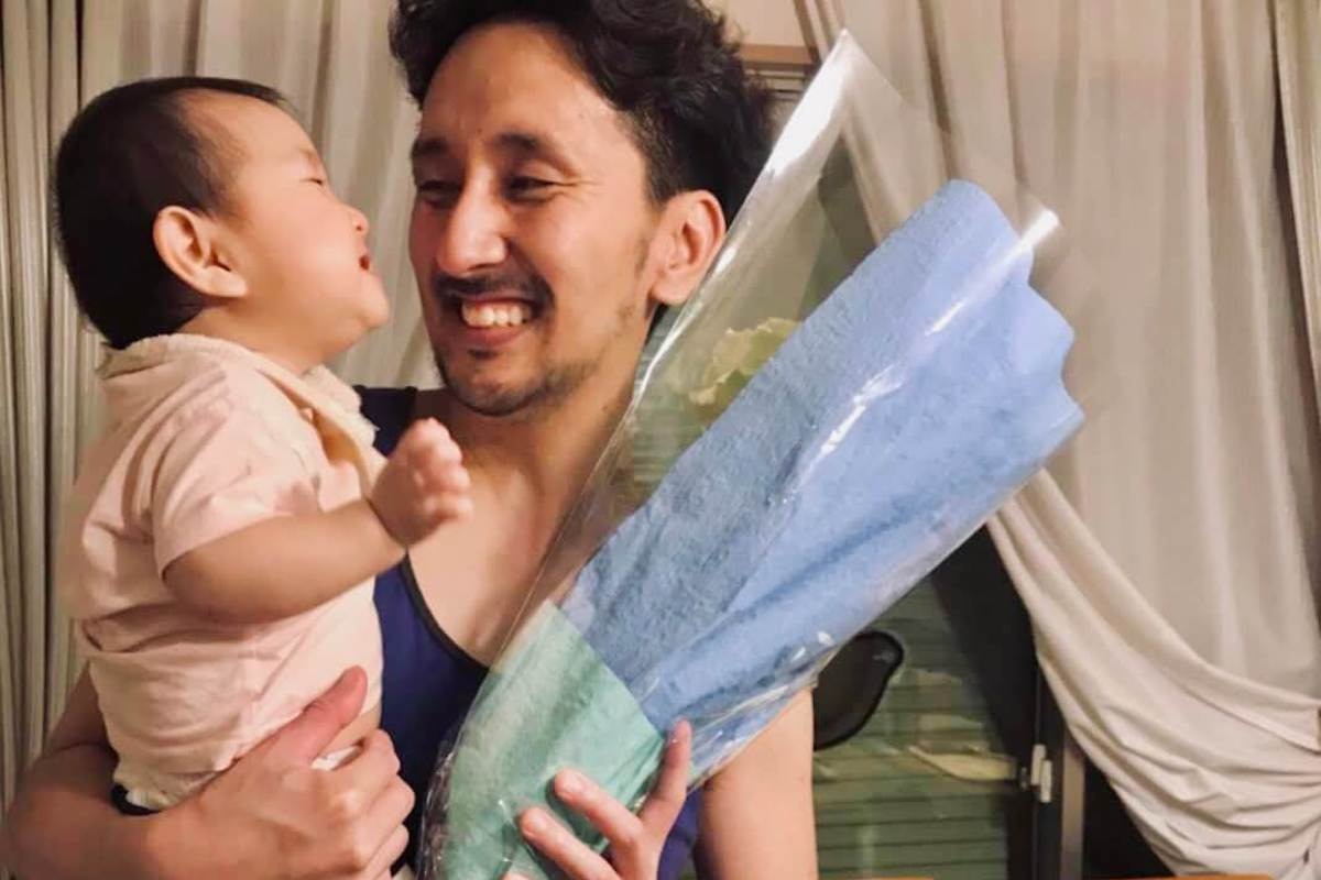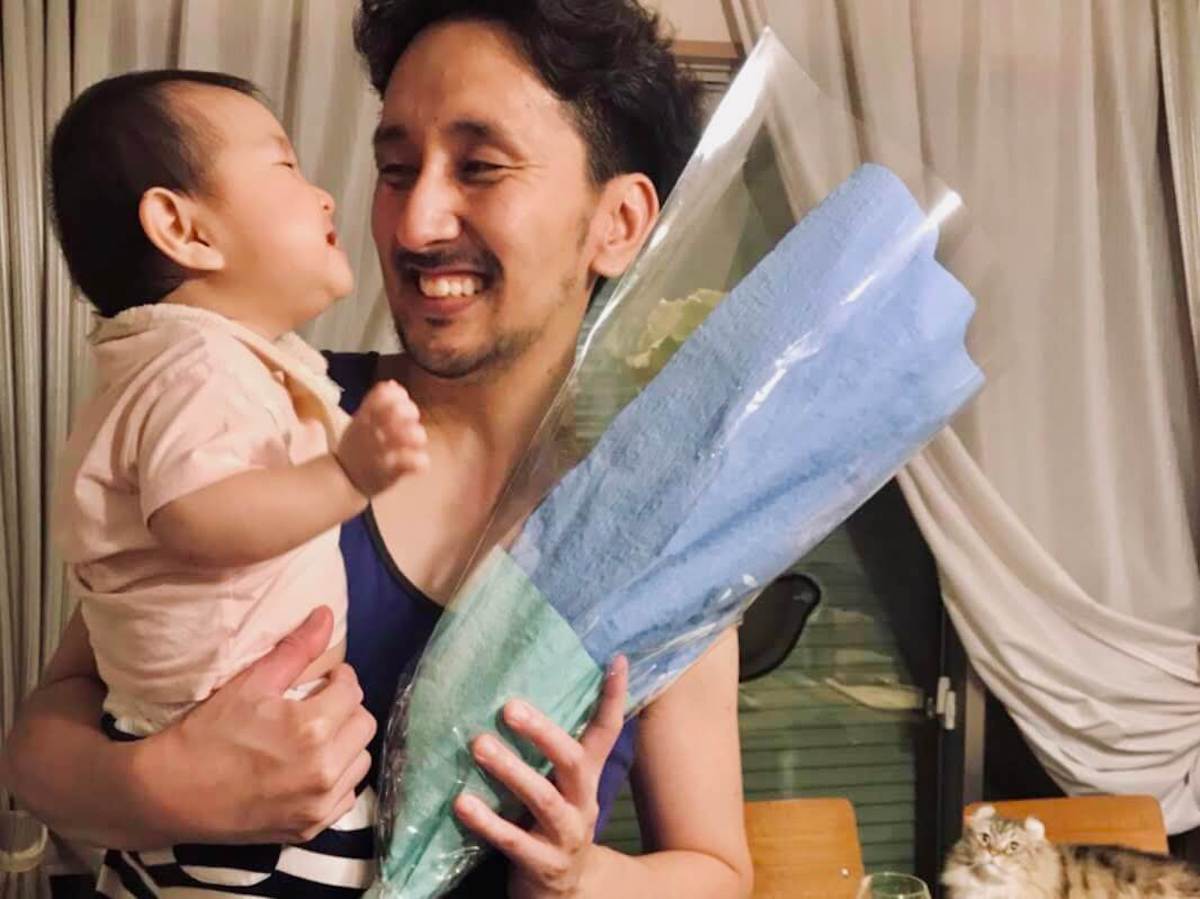 当時はまだ0歳だった娘と、妻にもらったお花を持って。ネコのフジくんも「え? 今日、なにか特別な日?」と言わんばかりの顔をしています。