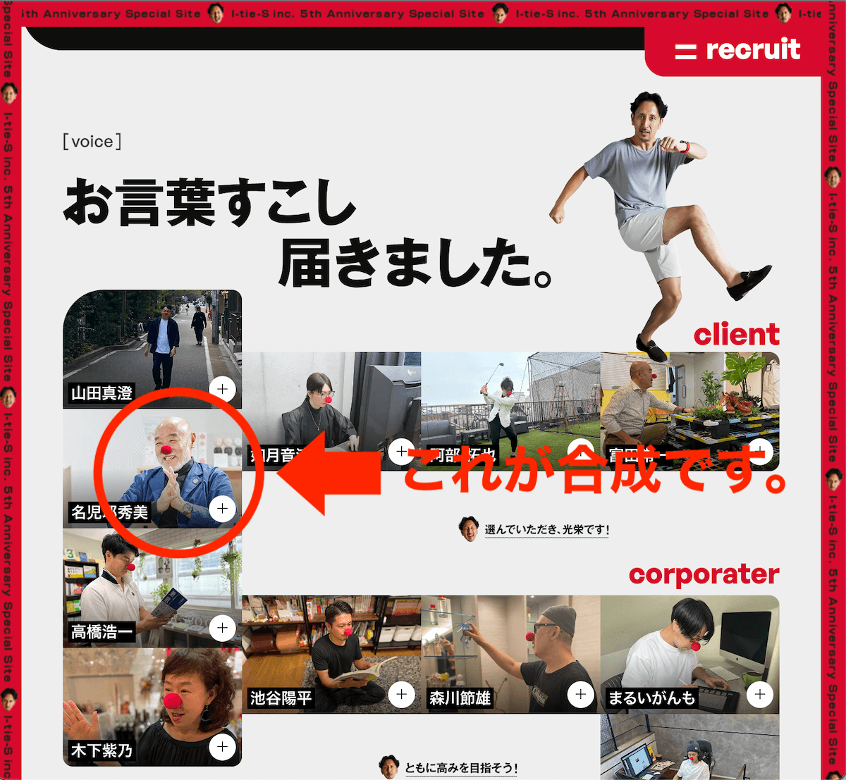 そしてあとひとつは、「VOICE」というコンテンツ内。僕が尊敬してやまない経営者、アッシュコンセプトの名児耶さんです。こちらは時間の関係などで、合成することとなりました。