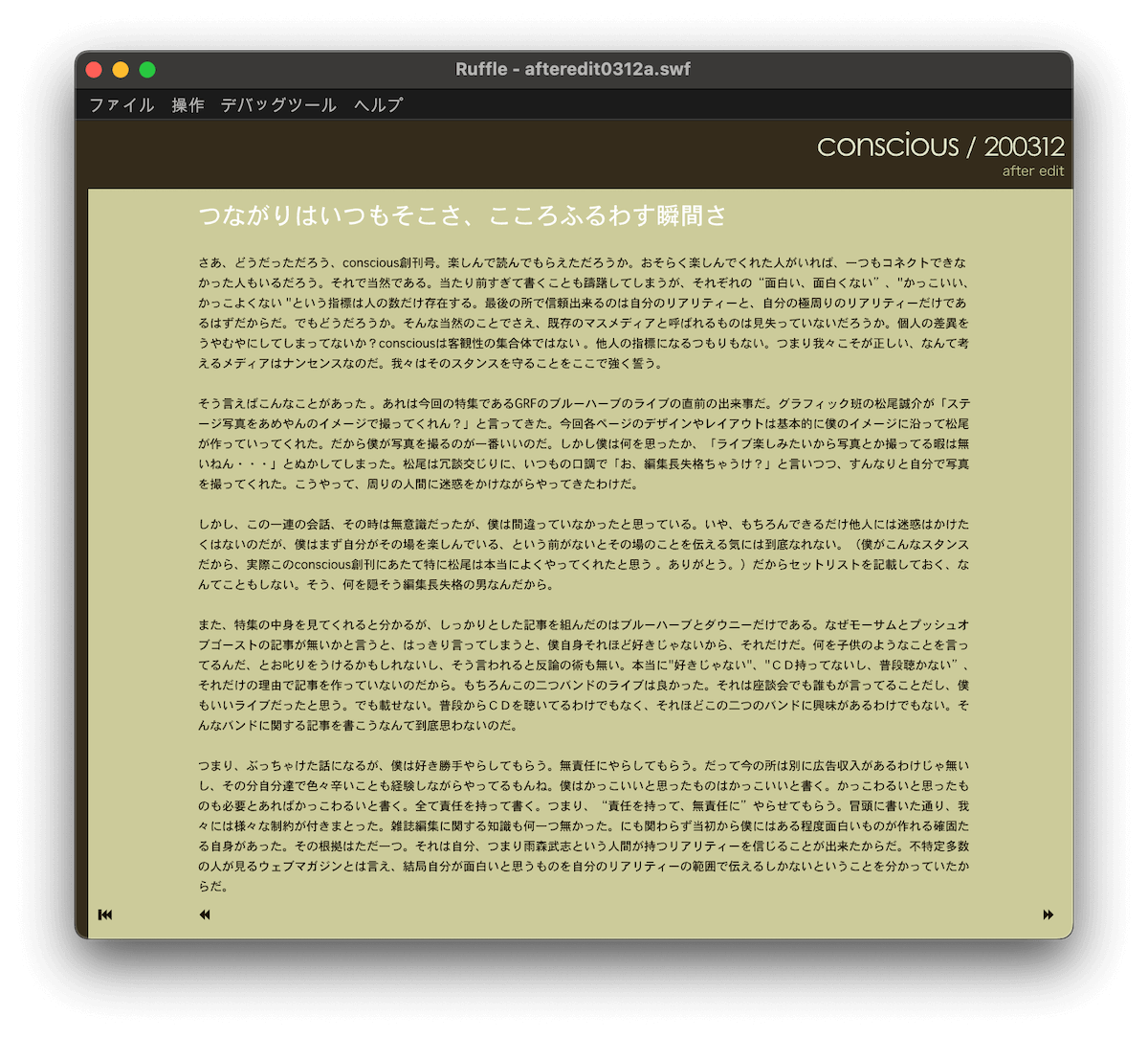 Webマガジンの名前は『conscious(コンシャス)』に決まります。毎号60ページくらいで、発行は隔月。今の若い世代には馴染みがないとは思いますが『Flash(フラッシュ)』というブラウザ上で動くファイルを用いて、ページの両端にあるボタンをクリックしながらページをめくっていくものでした。