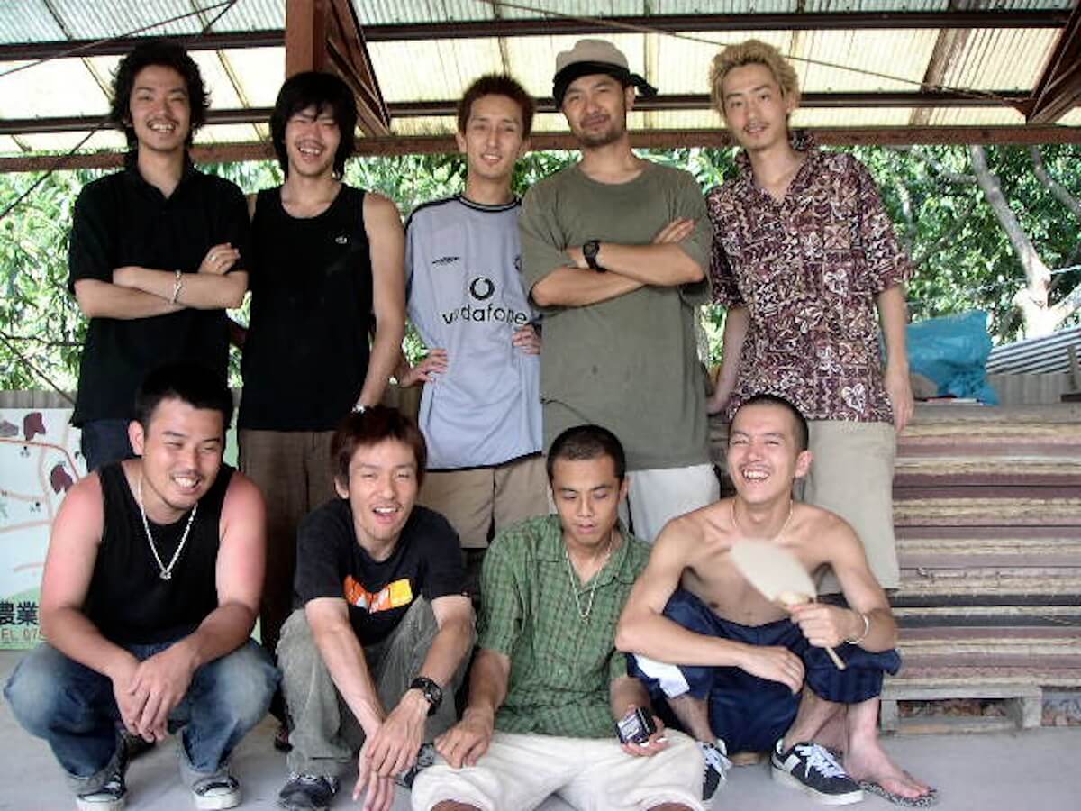 初期メンバーで撮影した1枚。野外でやったイベントの後片付けが終わった後に撮りました。僕は20年がたった今でもパジャマとして使っているマンチェスター・ユナイテッドのユニフォームを着ています。