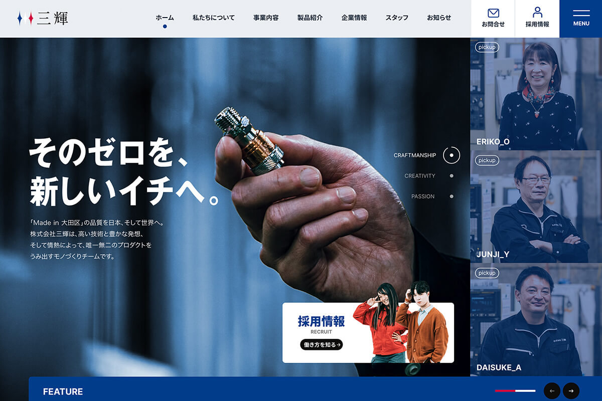 町工場の街、大田区にある三輝様の企業サイトです。こちらも写真を効果的に使った例として、非常に多くのギャラリーサイトで紹介していただきました。