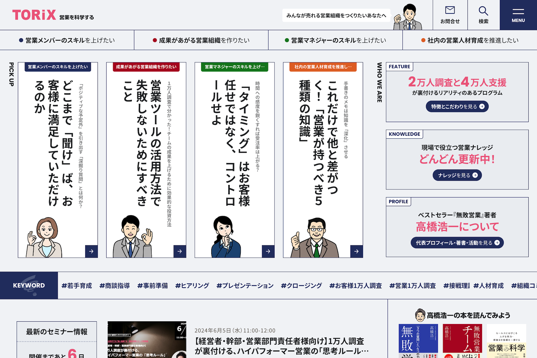 「営業」をはじめとしたビジネスにおける方法論のレクチャーを目的としたサイトはたくさんあります。それらのデザインは非常にビジネスライクなものが多く、いかにも「ロジカルに説明しています!」的な、まるでアカデミックな論文でも読んでいるような気持ちになる堅めなものがほとんど。そういった競合とはまったく違うイメージをつくり出すために、最初からイラストを使うと決まっていた気がします。