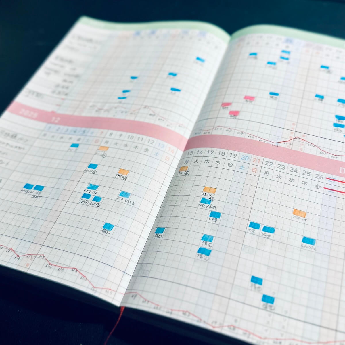 これも何度か書いていますが、「そもそもなんでアナログで管理するの?」「googleカレンダー一択でしょ!」と思われそうですが、僕は「ペンを持ち、紙に書く」というフィジカルな行為そのものが好きなので、スケジュール管理や進捗管理もさることながら、書くことそれ自体が目的というか、もうここは効率とかではなく、趣味の世界というか、フェチの世界というか、そういう感覚であり、今後も絶対に辞めることはないと思います。