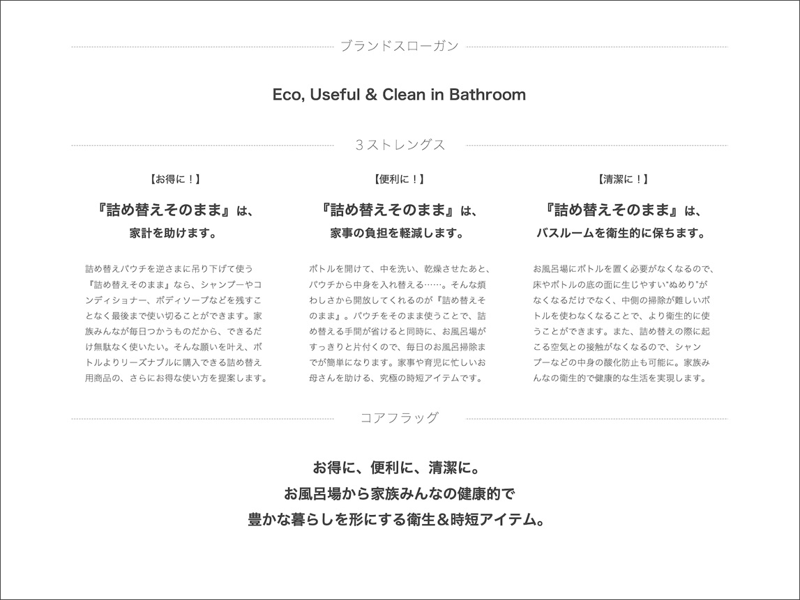 そうでしたね。この商品の特徴って、めちゃめちゃざっくりいうと、「詰め替えパックをそのまま使える」っていうことと、「ぶら下げて使う」っていう2つですよね。前者はそのままネーミングになっているので、後者の方にもフォーカスできました。