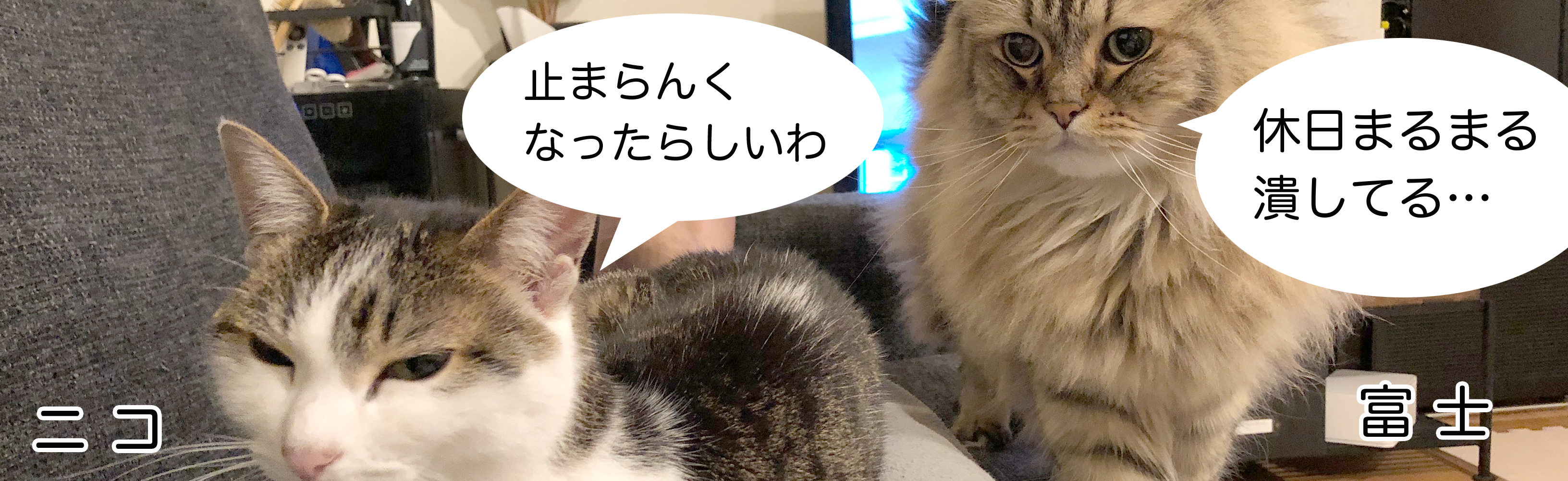 アイタイス社長、雨森の愛猫「富士」と「ニコ」がアイタイスに押しかけて好き勝手に情報をお届けするマンガコラム。