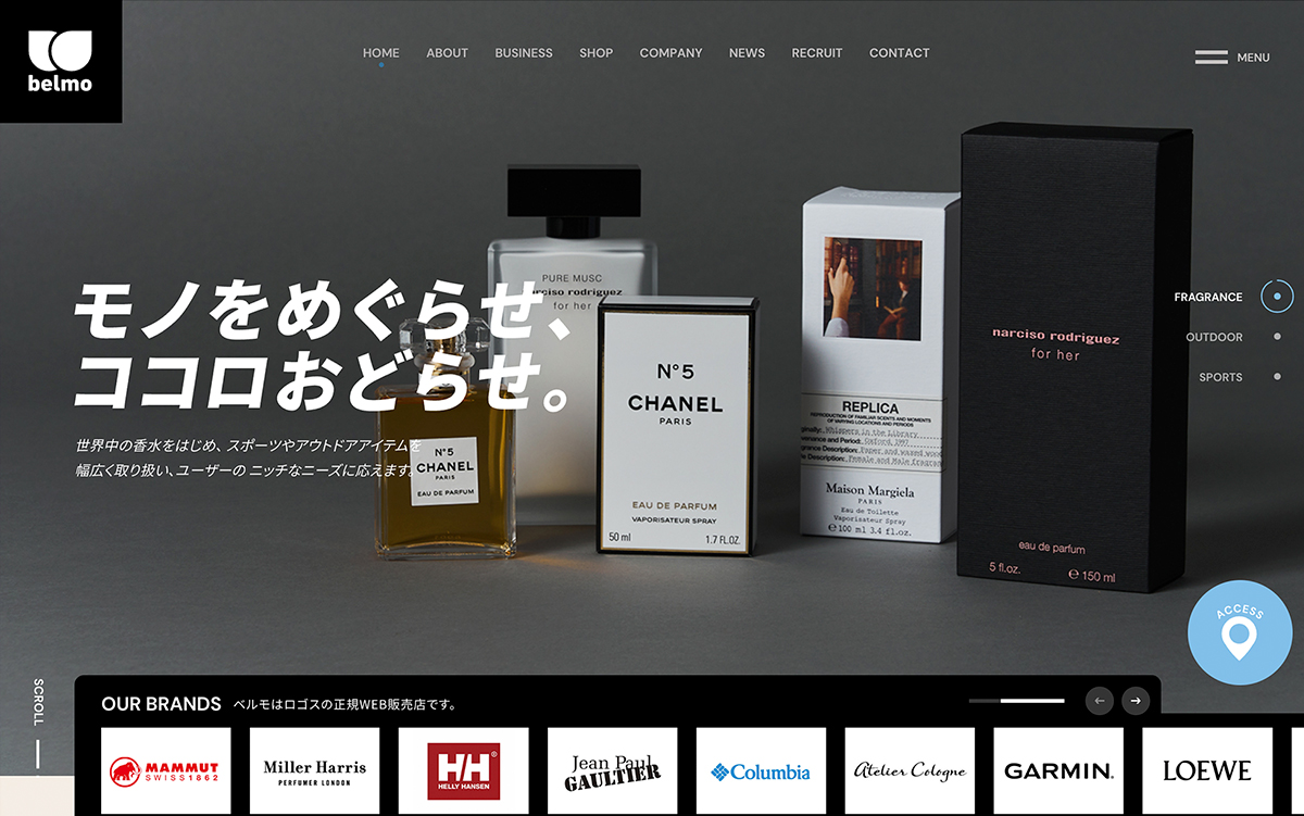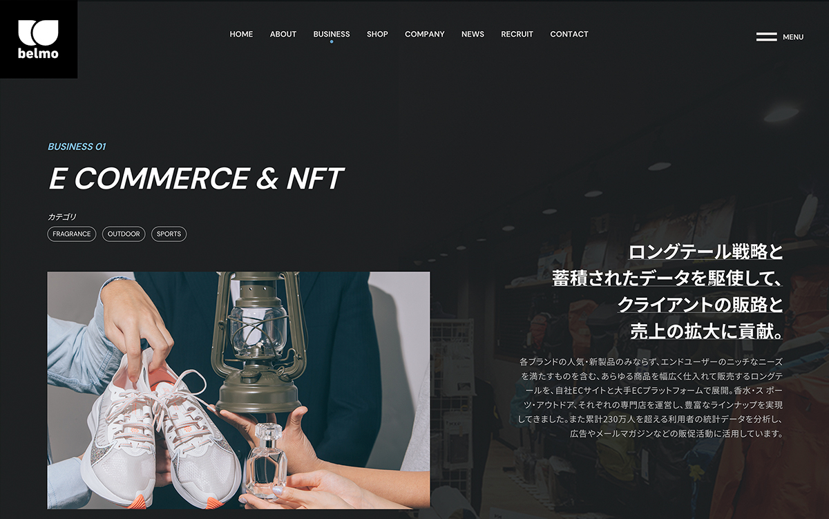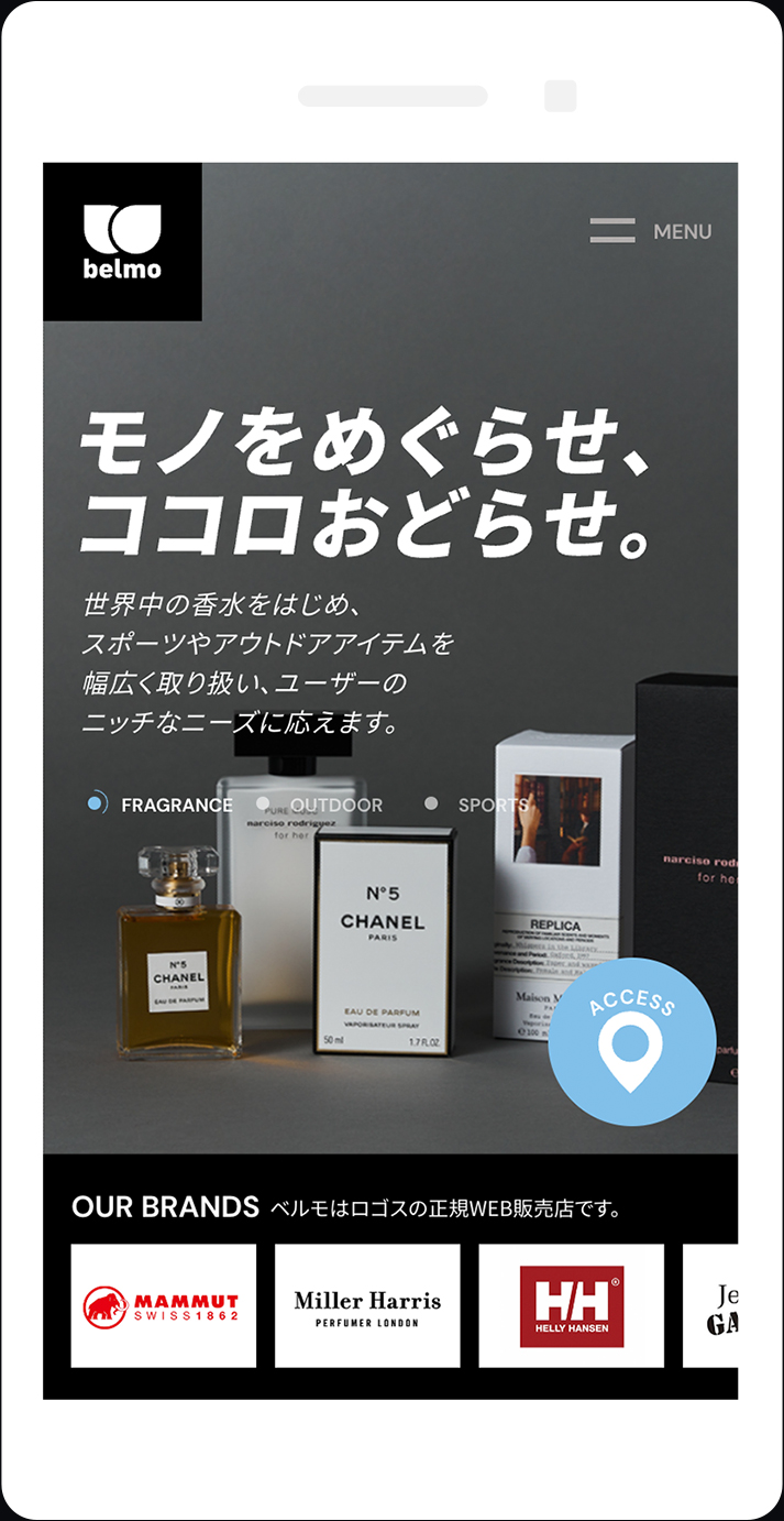 世界中の香水を中心に、スポーツやアウトドアなど、幅広い商材を扱うオンラインショップを運営すると同時に、実店舗『OUT DOOR STYLE BELEMO』の運営、さらにオリジナルブランド『MY METHOD』も展開する株式会社ベルモ様の公式サイト。たくさんの写真を使いながら、それぞれの事業の強みを正確に訴求できるような表現を意識している。