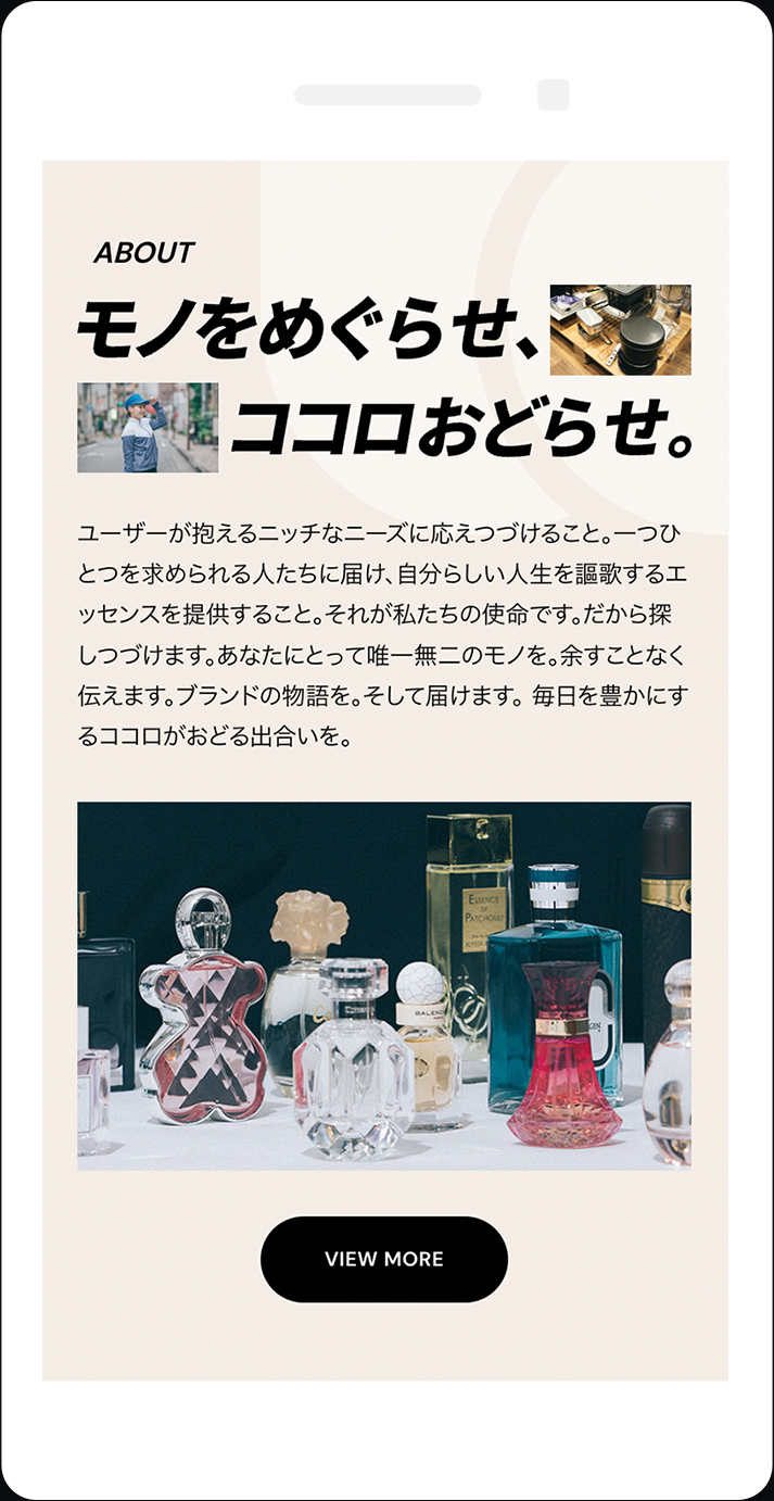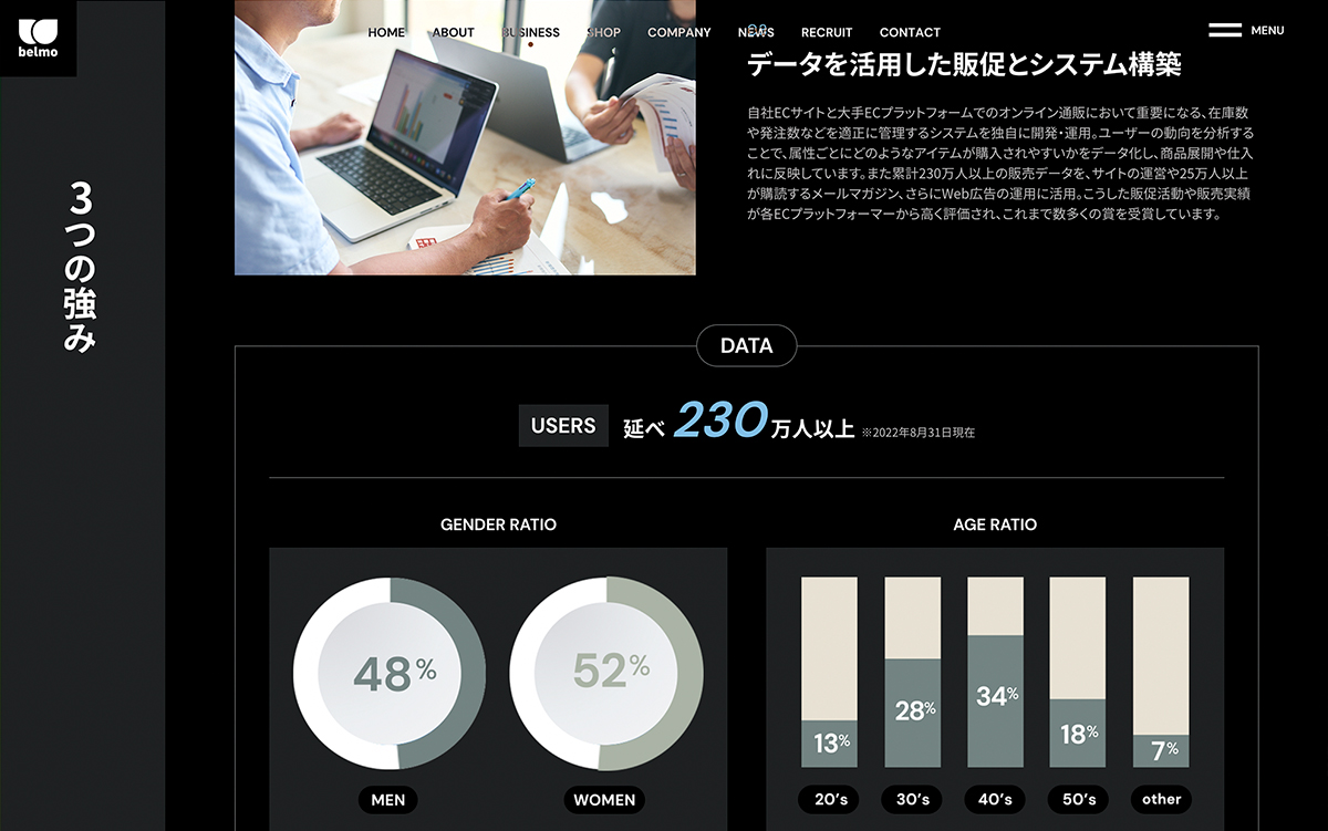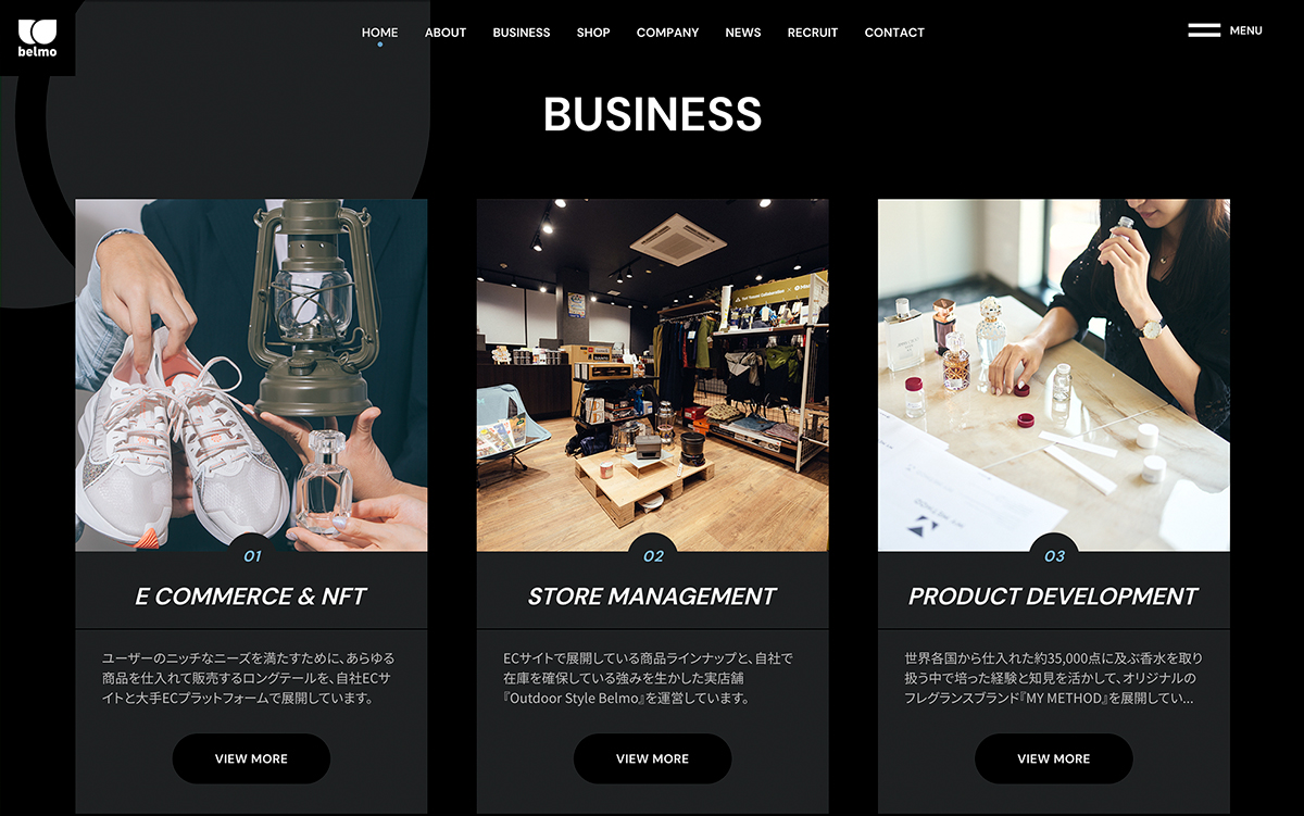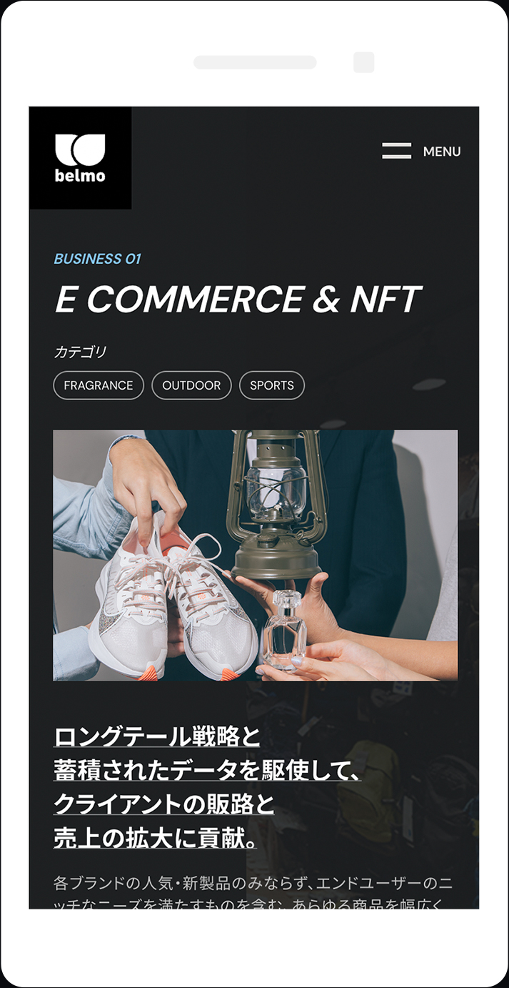 世界中の香水を中心に、スポーツやアウトドアなど、幅広い商材を扱うオンラインショップを運営すると同時に、実店舗『OUT DOOR STYLE BELEMO』の運営、さらにオリジナルブランド『MY METHOD』も展開する株式会社ベルモ様の公式サイト。たくさんの写真を使いながら、それぞれの事業の強みを正確に訴求できるような表現を意識している。