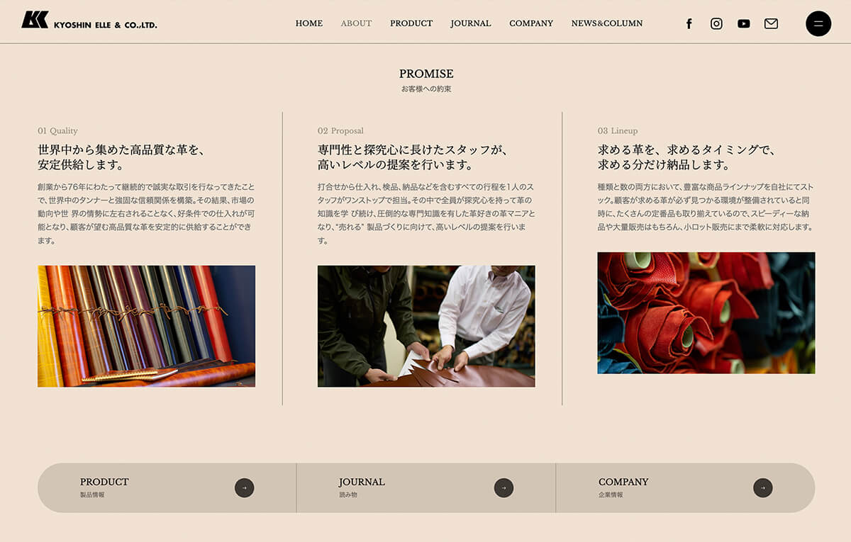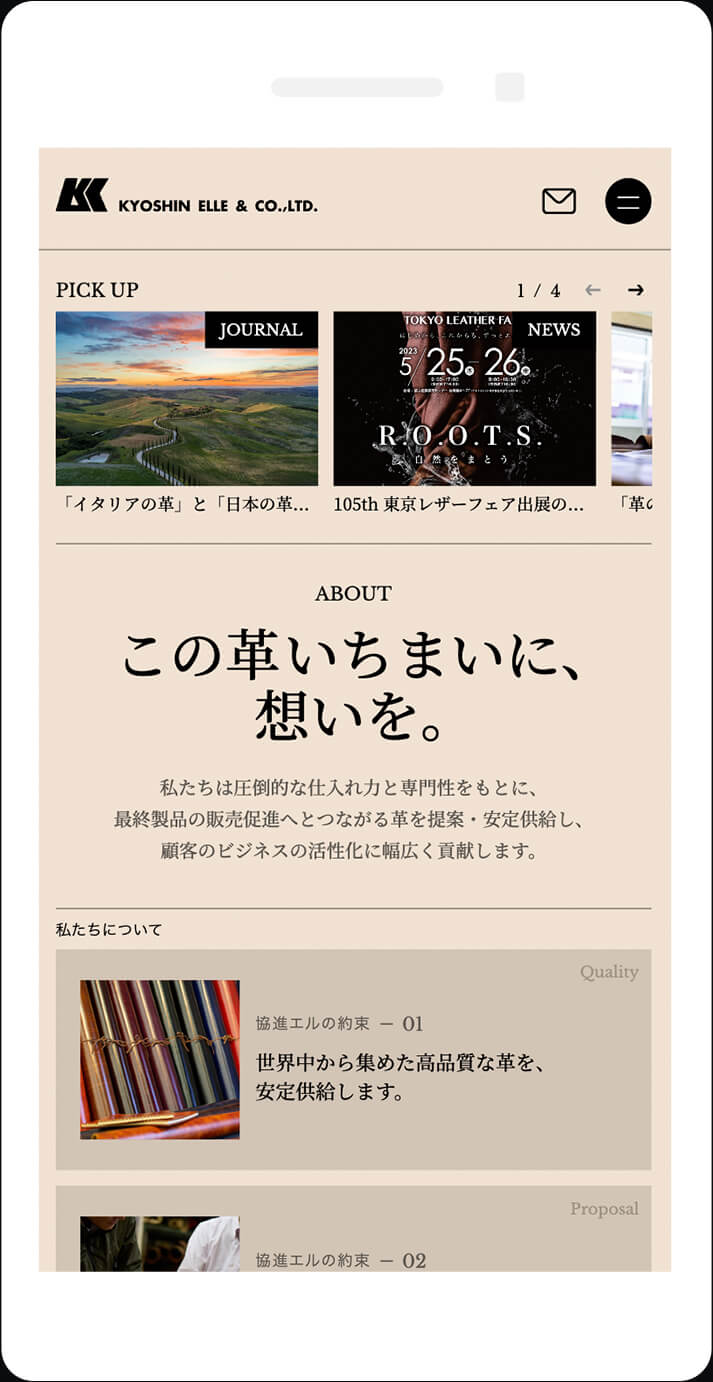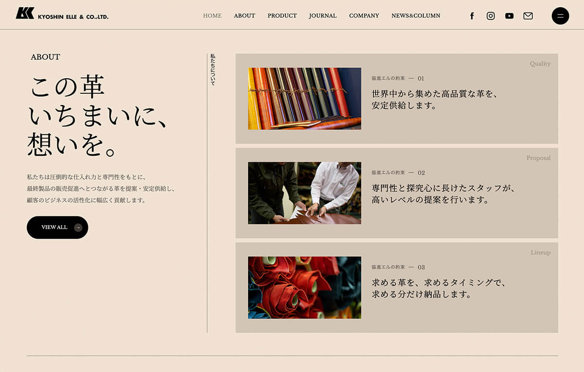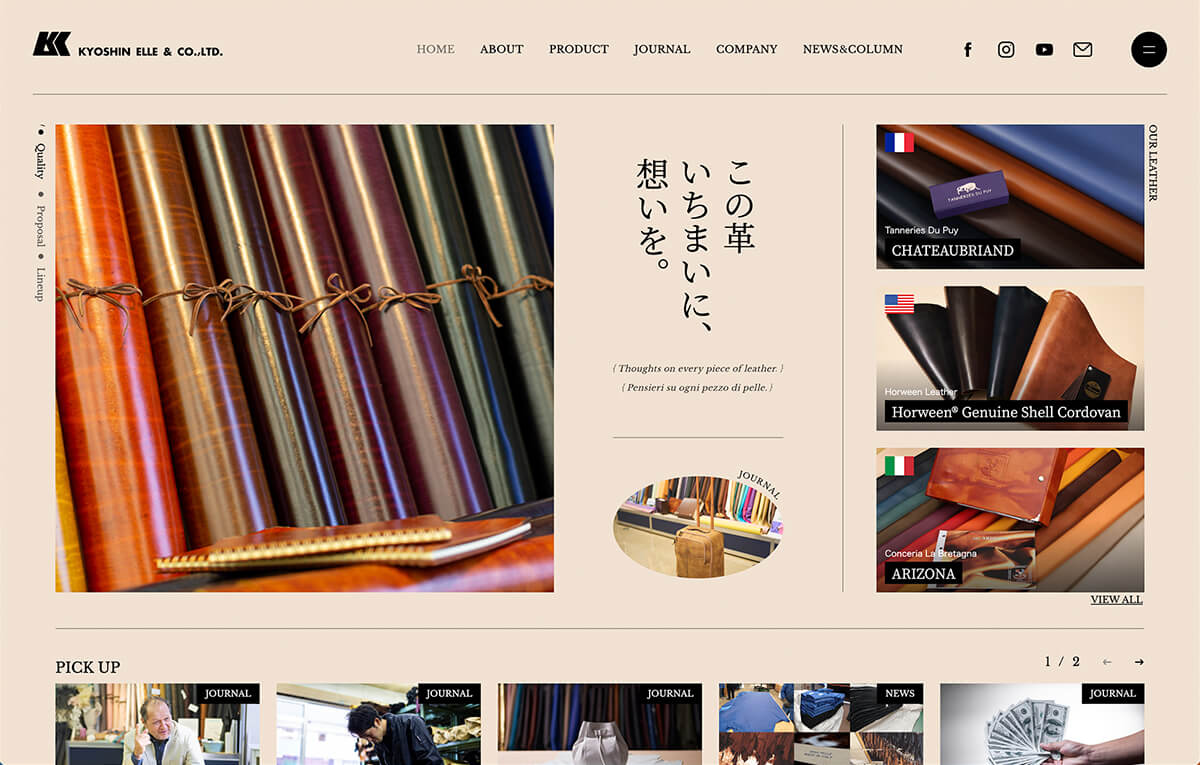創業約70年。海外・国内の高品質な革を扱う老舗皮革卸業者『協進エル』の公式サイトの制作を担当しました。製品紹介や会社概要といった一般的なコンテンツに加えて、読み物系コンテンツである『ジャーナル』を展開。同業他社と比べた独自性の打ち出しや、発信力の強化、高い更新性を実現するコーポレートサイトとなっています。