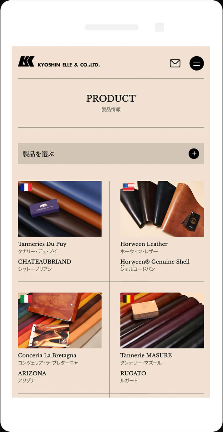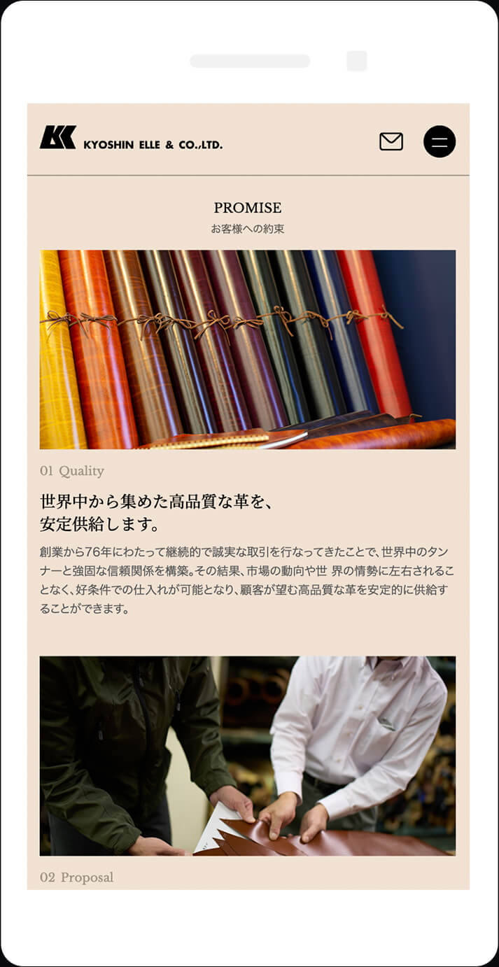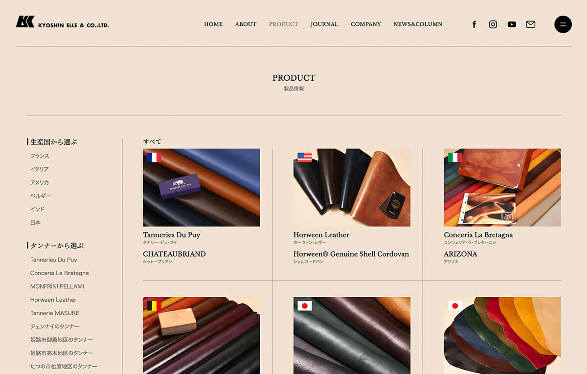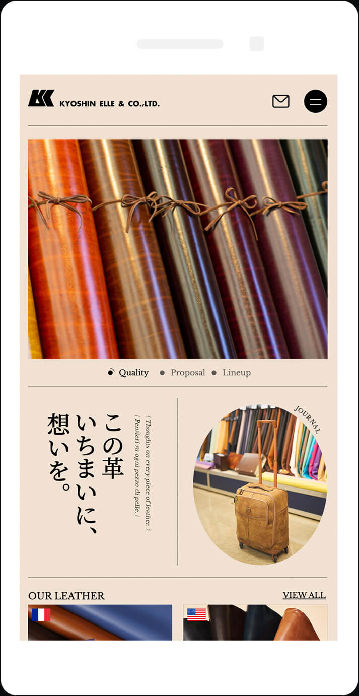 創業約70年。海外・国内の高品質な革を扱う老舗皮革卸業者『協進エル』の公式サイトの制作を担当しました。製品紹介や会社概要といった一般的なコンテンツに加えて、読み物系コンテンツである『ジャーナル』を展開。同業他社と比べた独自性の打ち出しや、発信力の強化、高い更新性を実現するコーポレートサイトとなっています。