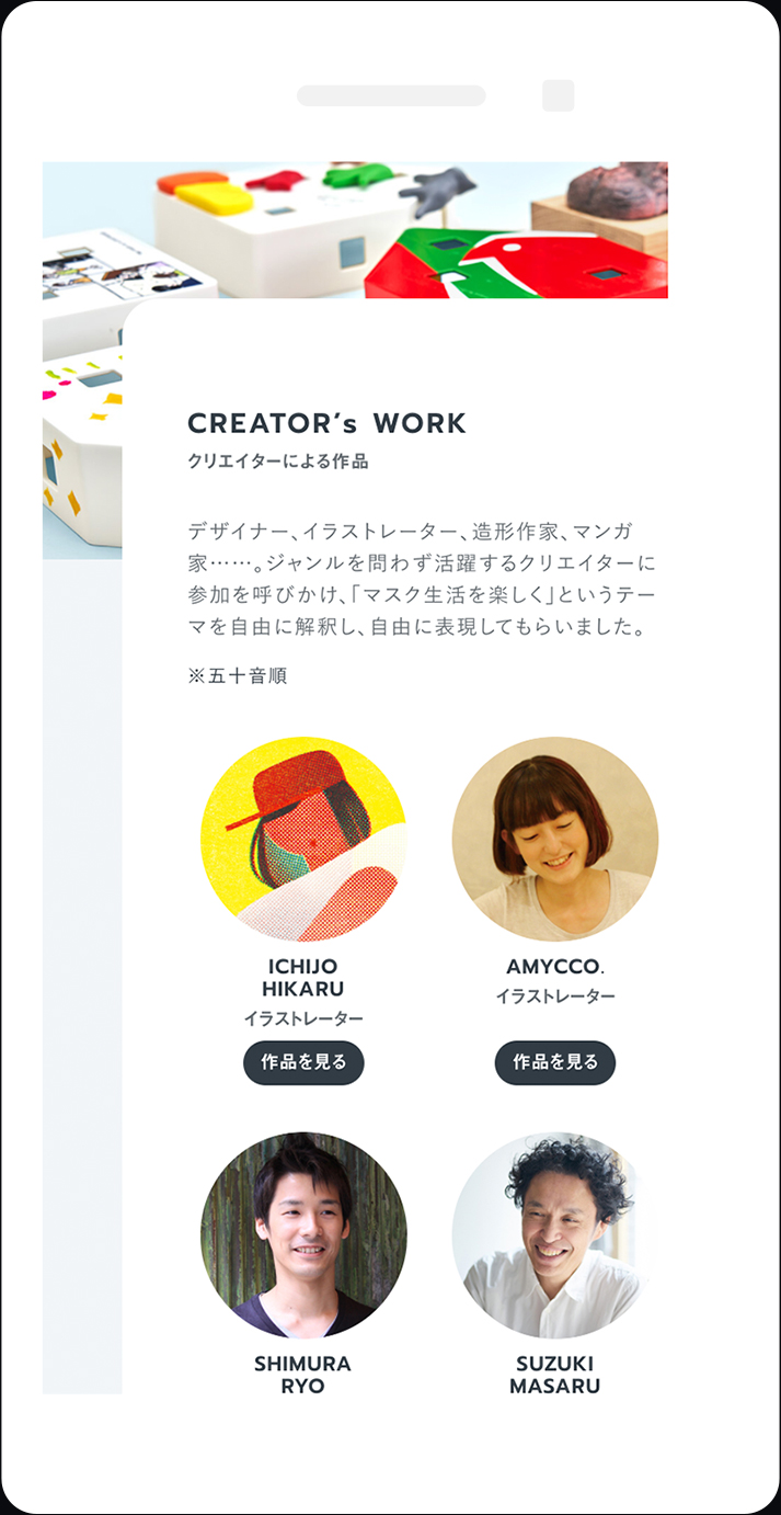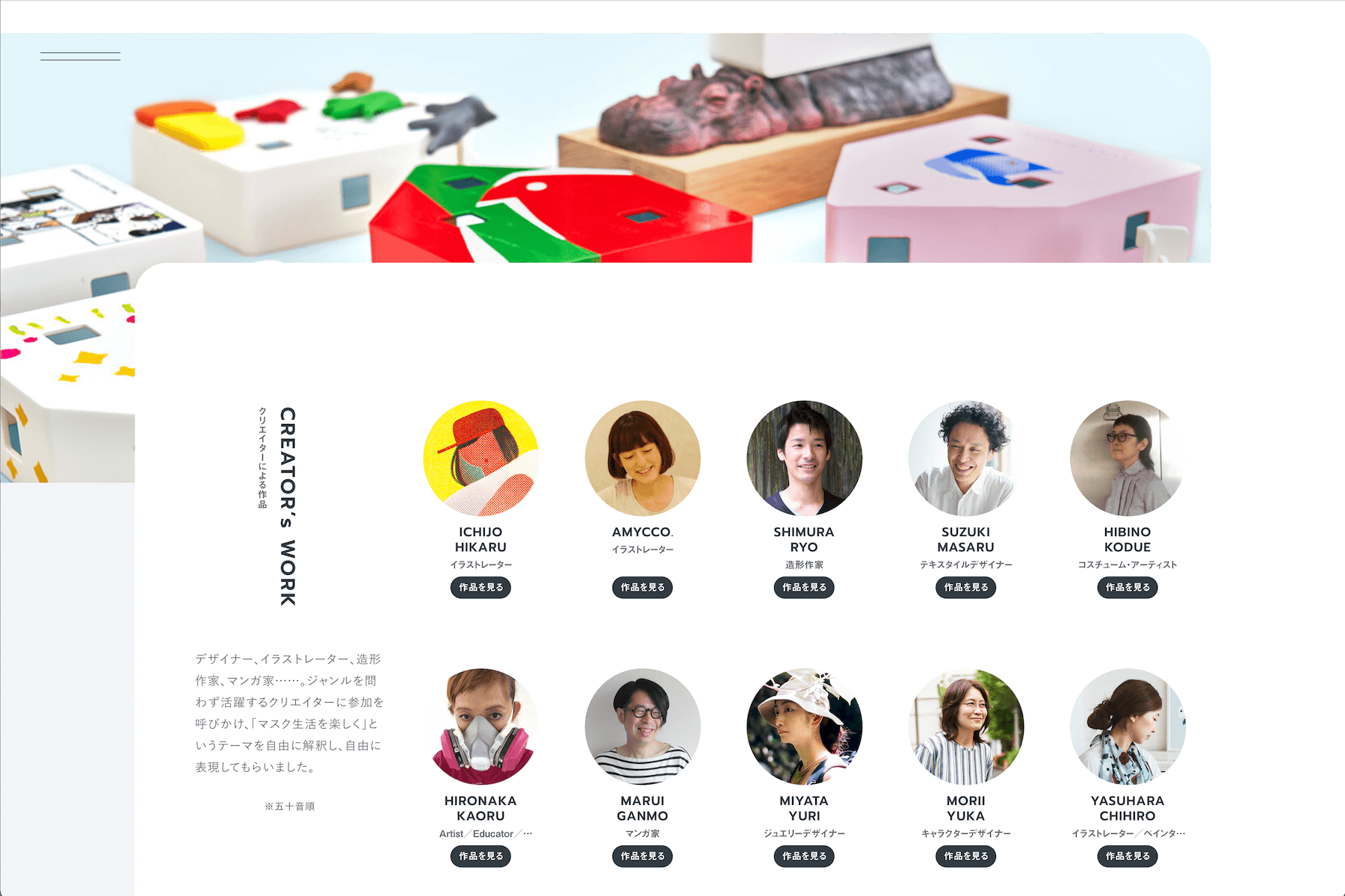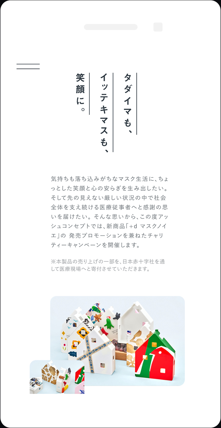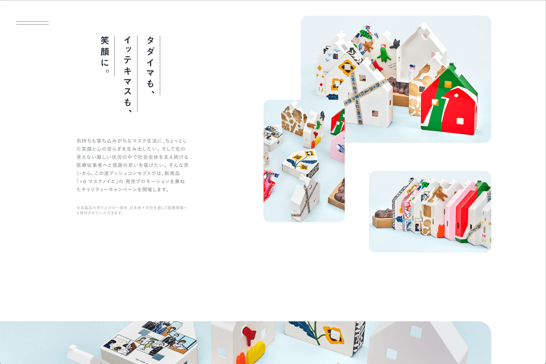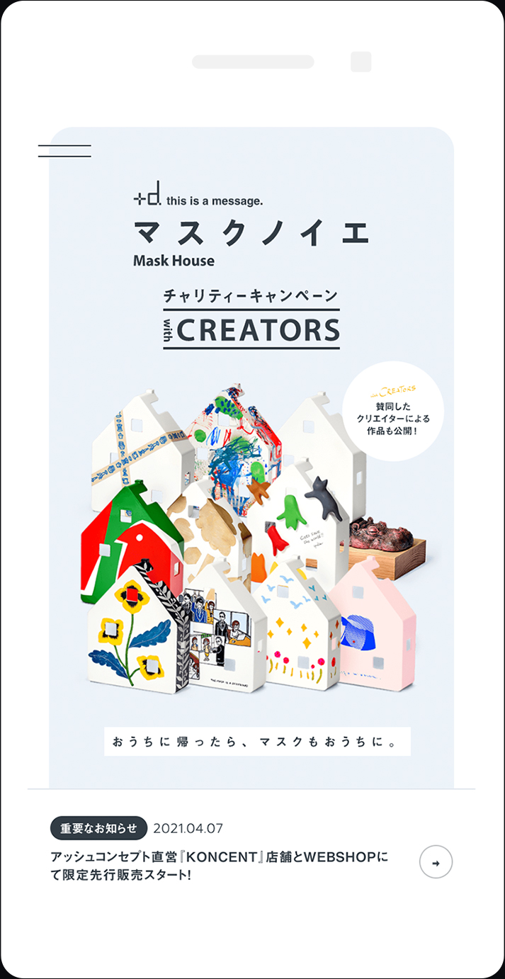 数々の人気アイテムを世に送り出してきたデザインブランド「+d(プラスディー)」から2021年4月に発売された「マスクノイエ」のリリースを記念したキャンペーンサイト。10名のクリエイターが参加した作品のビジュアルを大胆に用いたデザインや、プロダクトを手掛けたデザイナーGentaChieのお二人をゲストに迎えた鼎談コンテンツを展開し、多くの話題を呼ぶことに成功した。