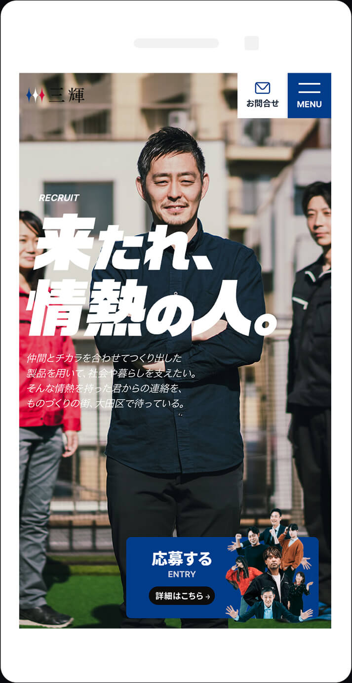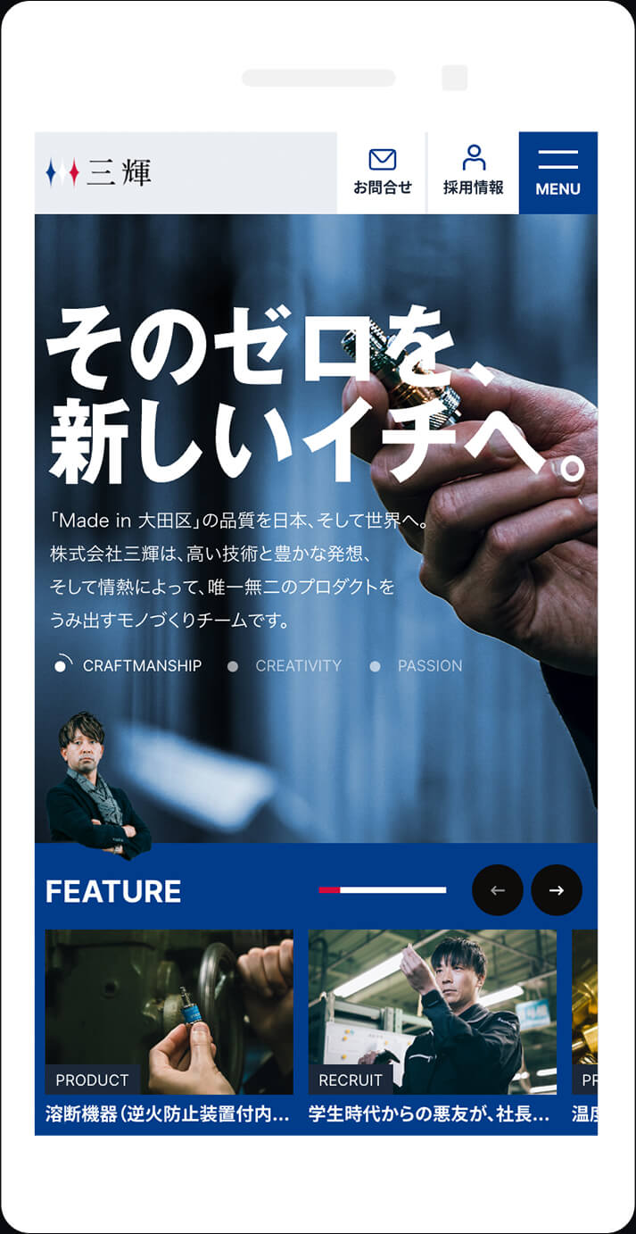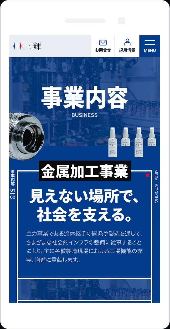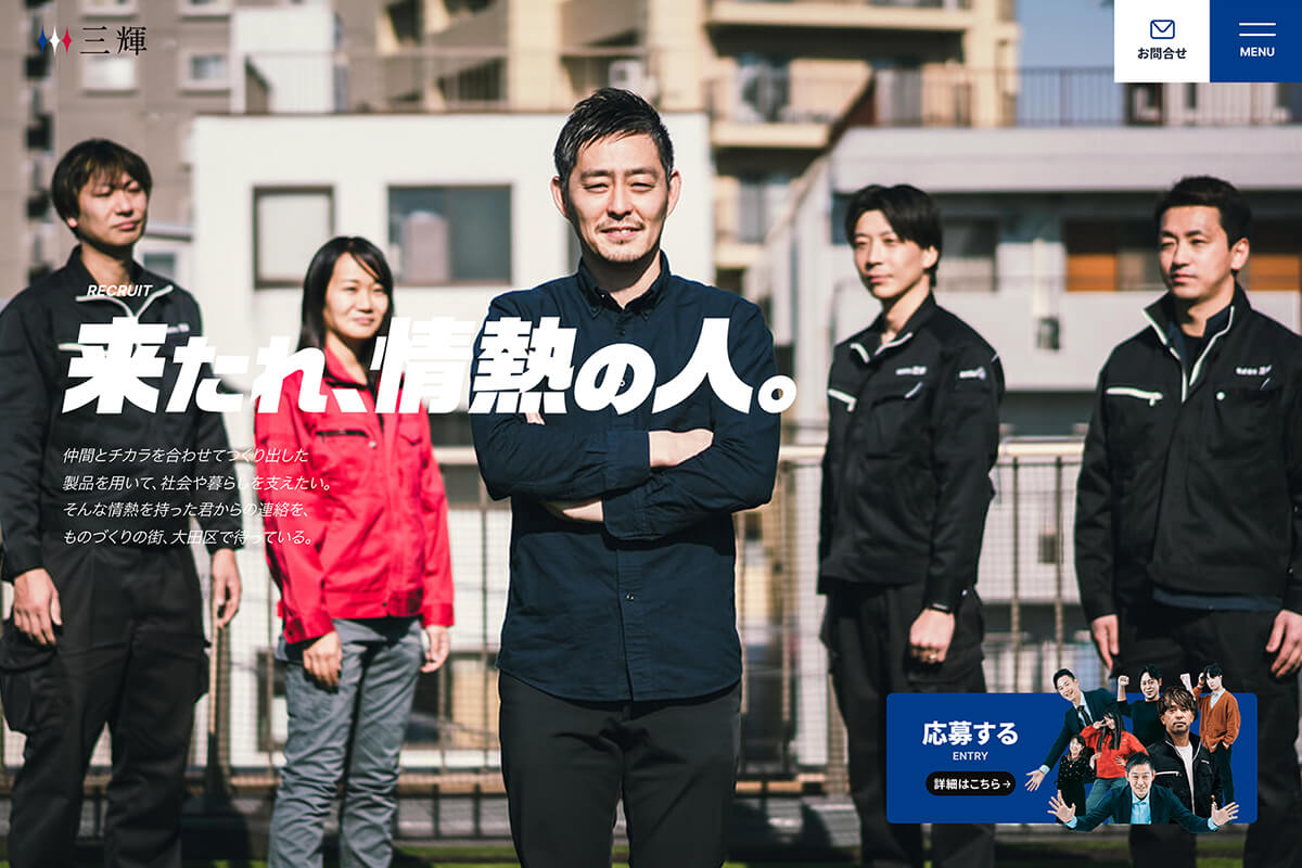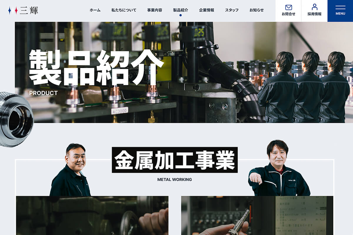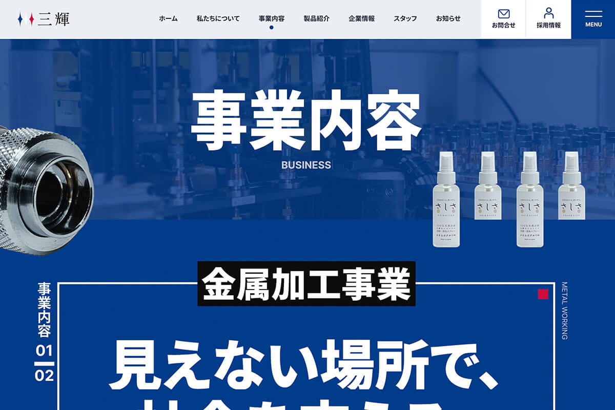 ものづくりの街、大田区を牽引する存在として半世紀上に渡って主力製品である『流体継手』や、時短・衛生アイテムとして大ヒット中の『詰め替えそのまま』などをつくるメーカー『株式会社 三輝』の公式サイトをリニューアル。扱う商材や事業内容が“地味”という問題を払拭するためにも、人物の切り抜きを多様するなどして、“ド派手”な演出をほどこした。