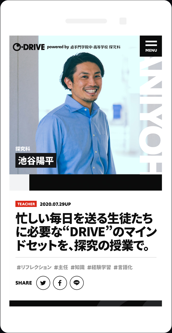 大阪府茨城市にある私立の教育機関、追手門学院中・高等学校の『探究科』が運営するオウンドメディア。プロジェクトがスタートすると同時に世の中を襲った新型コロナウイルスの影響で、想定していた取材がほとんどできない中、なんとか制作を進行。今後、生徒や先生、授業内容の情報の発信を通して、探究科が目指す新しい人材育成をサポートしていきます。
